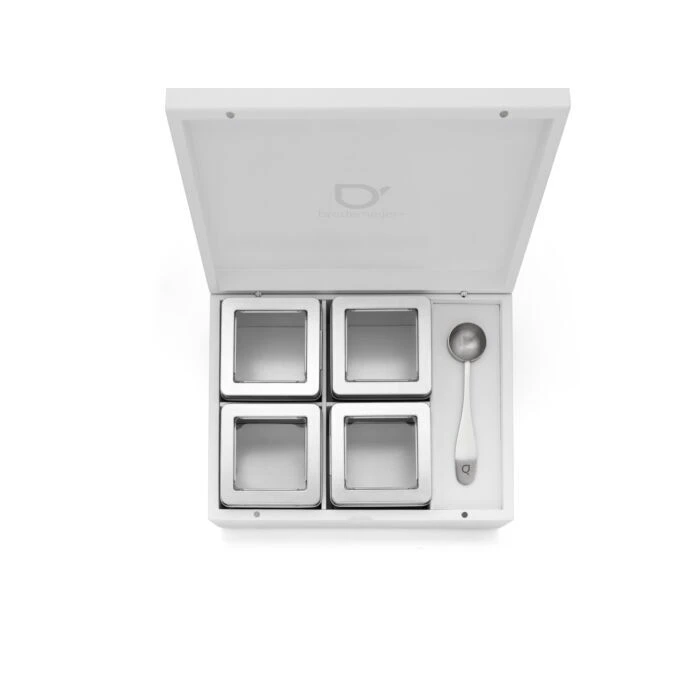 De theedoos van Bredemeijer is gemaakt van wit bamboe. De kist heeft een compacte afmeting. Het kistje wordt geleverd met vier blikjes en een theemaatlepel voor het bewaren, serveren en presenteren van losse thee.