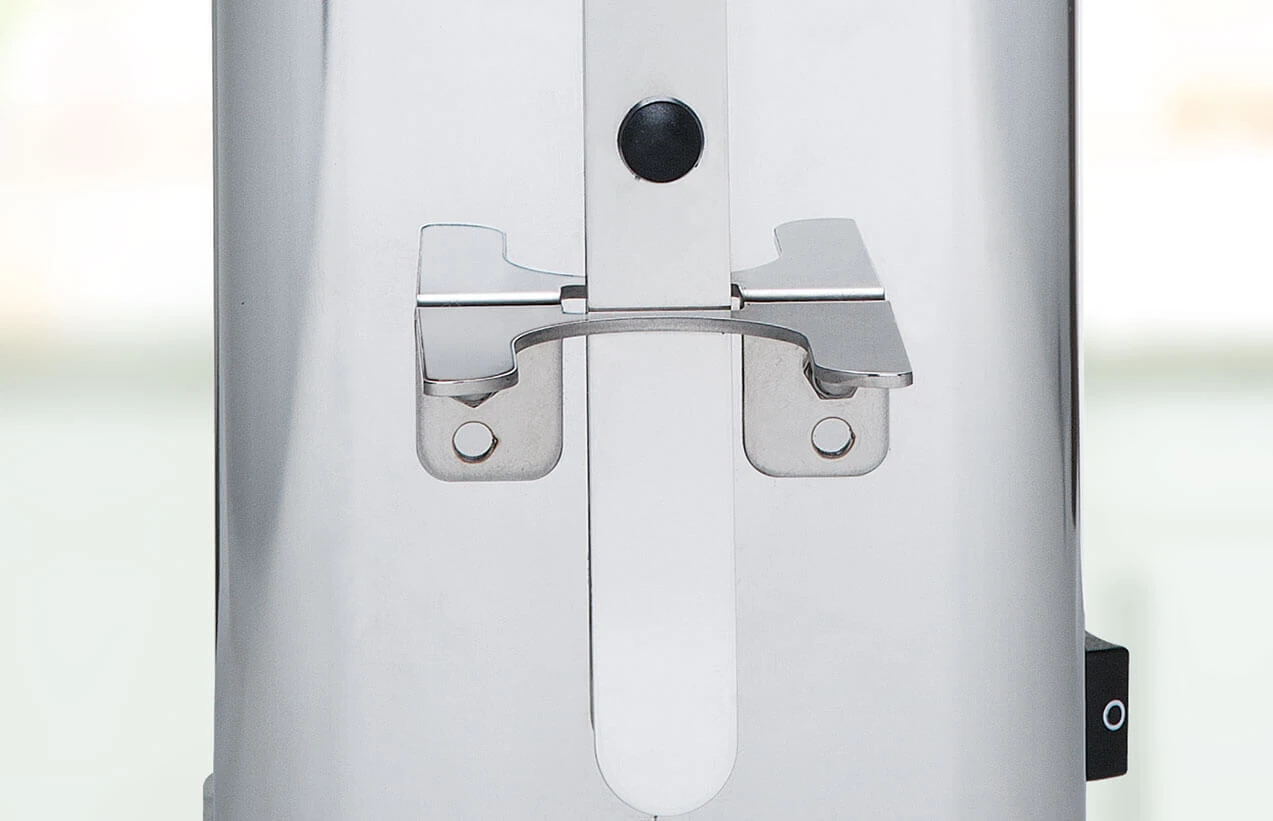 De koffiemolen heeft aan de zijkant een aan-/uitschakelaar, en aan de voorzijde steunen waarop u de filterdrager kunt rust. Deze steunen kunnen in hoogte worden versteld. Zodra u de drager in de steunen legt, tegen de activatieknop aan, start de molen automatisch.